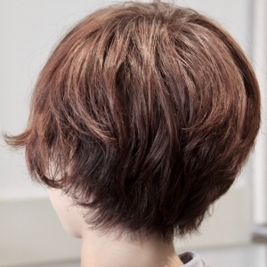直毛で動きが出ずらい髪質。ひし形シルエットになるよう耳の周りはカールを強めにしてメリハリのあるデザインに。