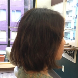 前上がりのボブにユルいカールを合わせる事で甘い雰囲気に。パーマをかける事でガラッと雰囲気が変わりました。